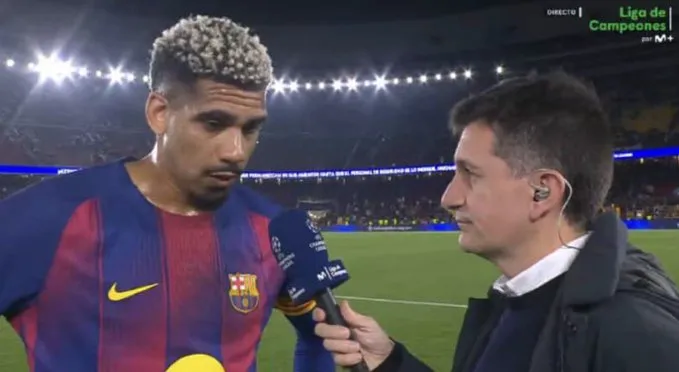 虎扑04月08日讯 欧冠1/4决赛,十人巴萨主场0-2不敌马竞。阿劳霍赛后接受采访。