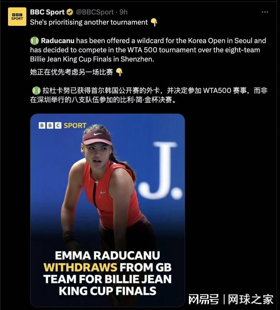 与此同时,前美网冠军艾玛·拉杜卡努因退出比利·简·金杯预选赛的决定引发了争议。值得一提的是,这已是拉杜卡努2025年第二次退出国家队赛事,她曾在今年4月份以需要“照顾身体”为由退出预选赛。